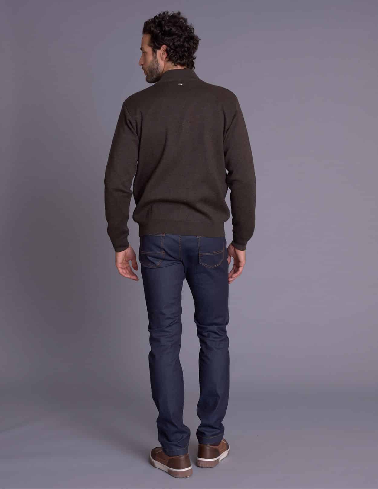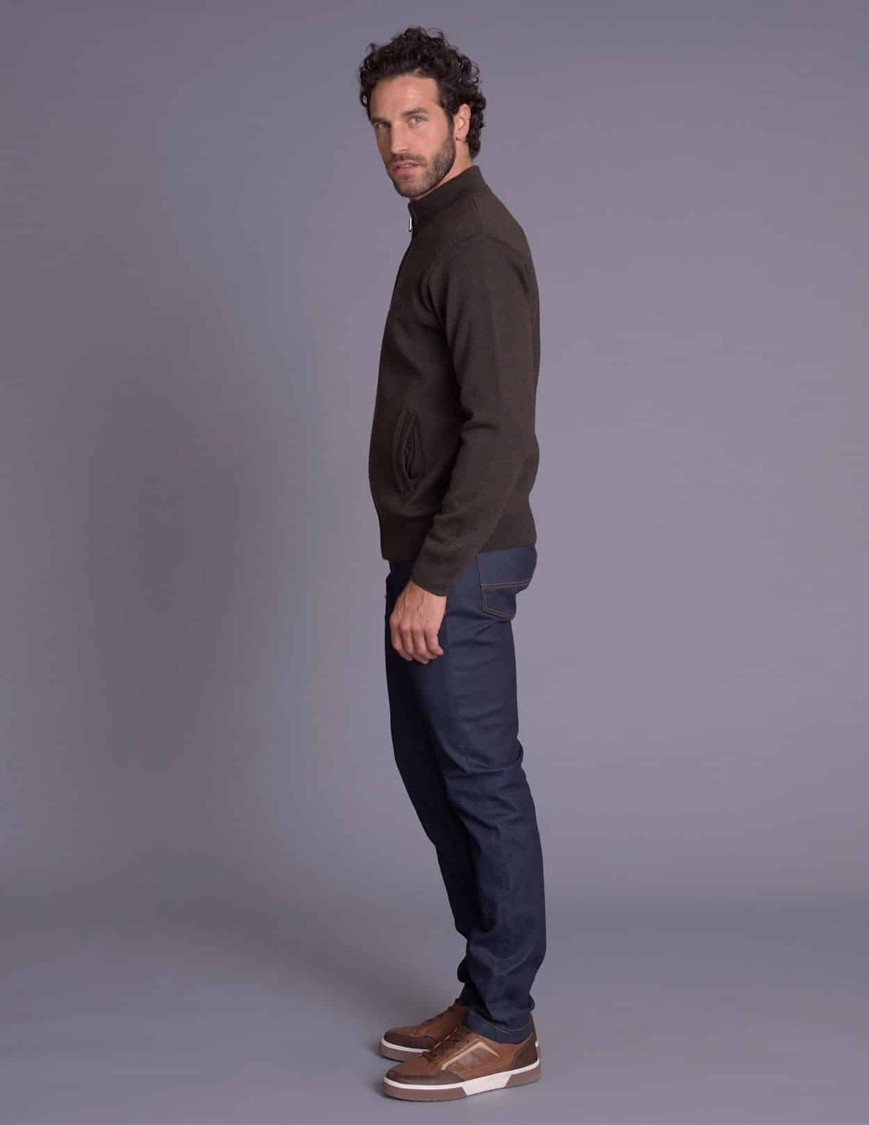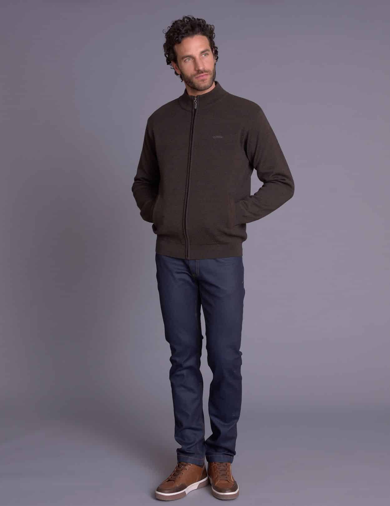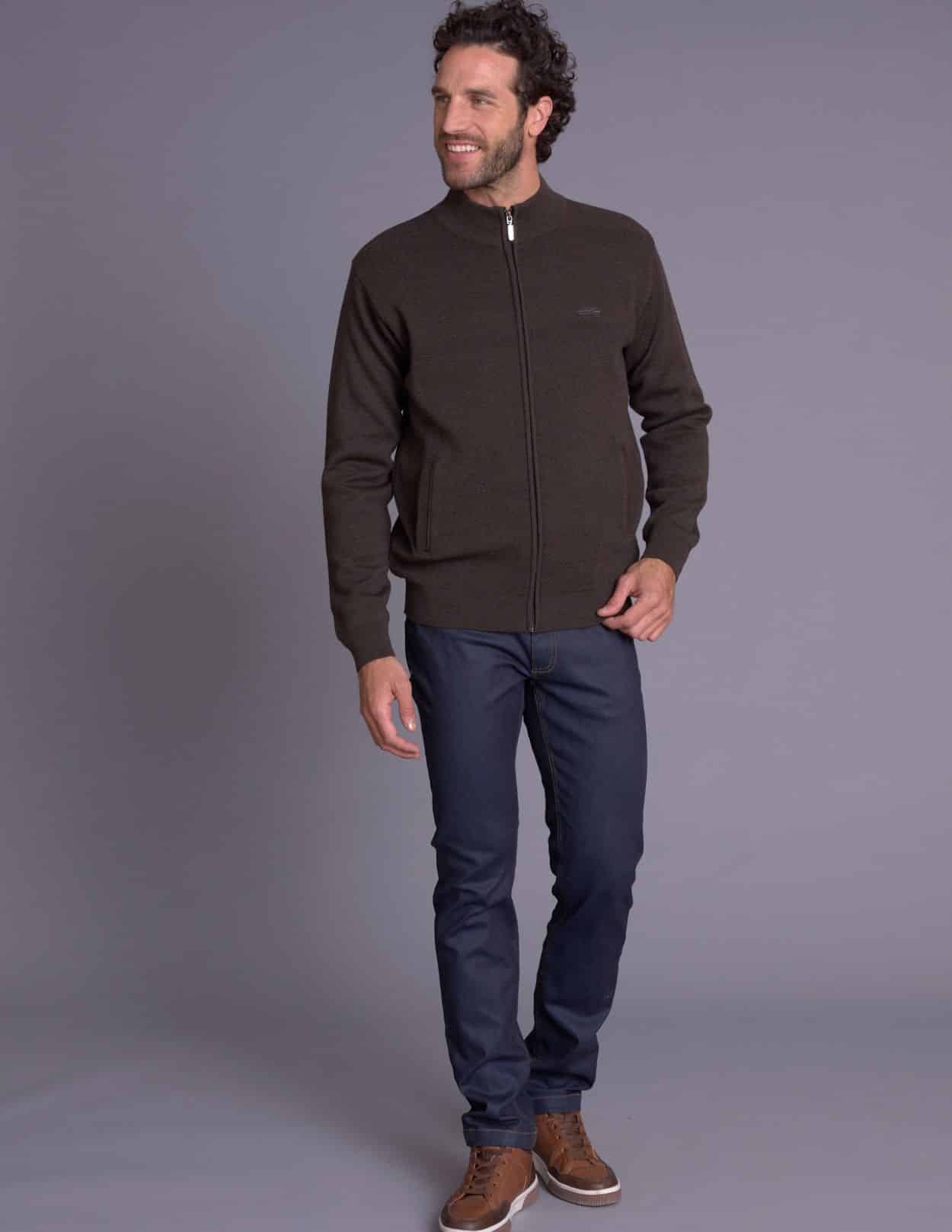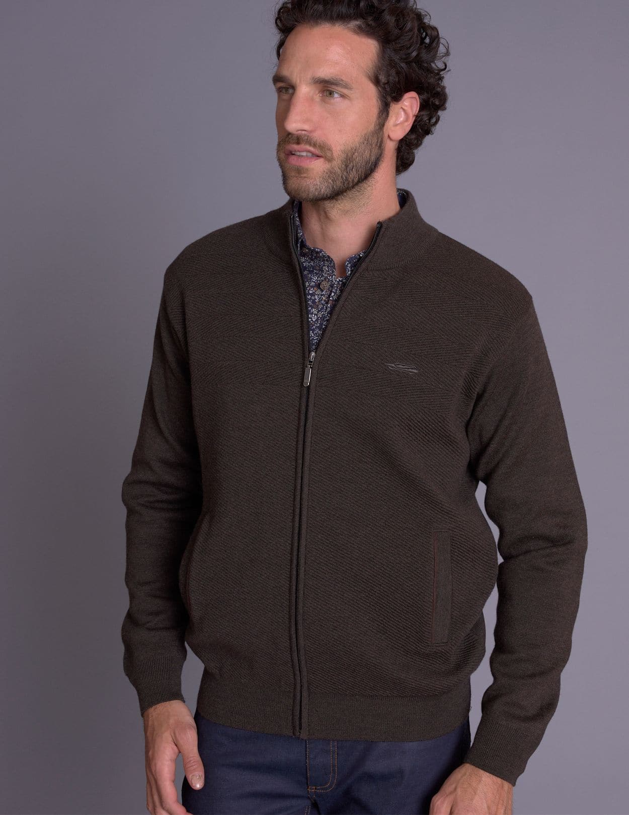 Gilet GUZET brun en maille fine laine-acrylique. Coupe ajustée, col montant zippé et finitions côtelées pour un style gentleman raffiné.