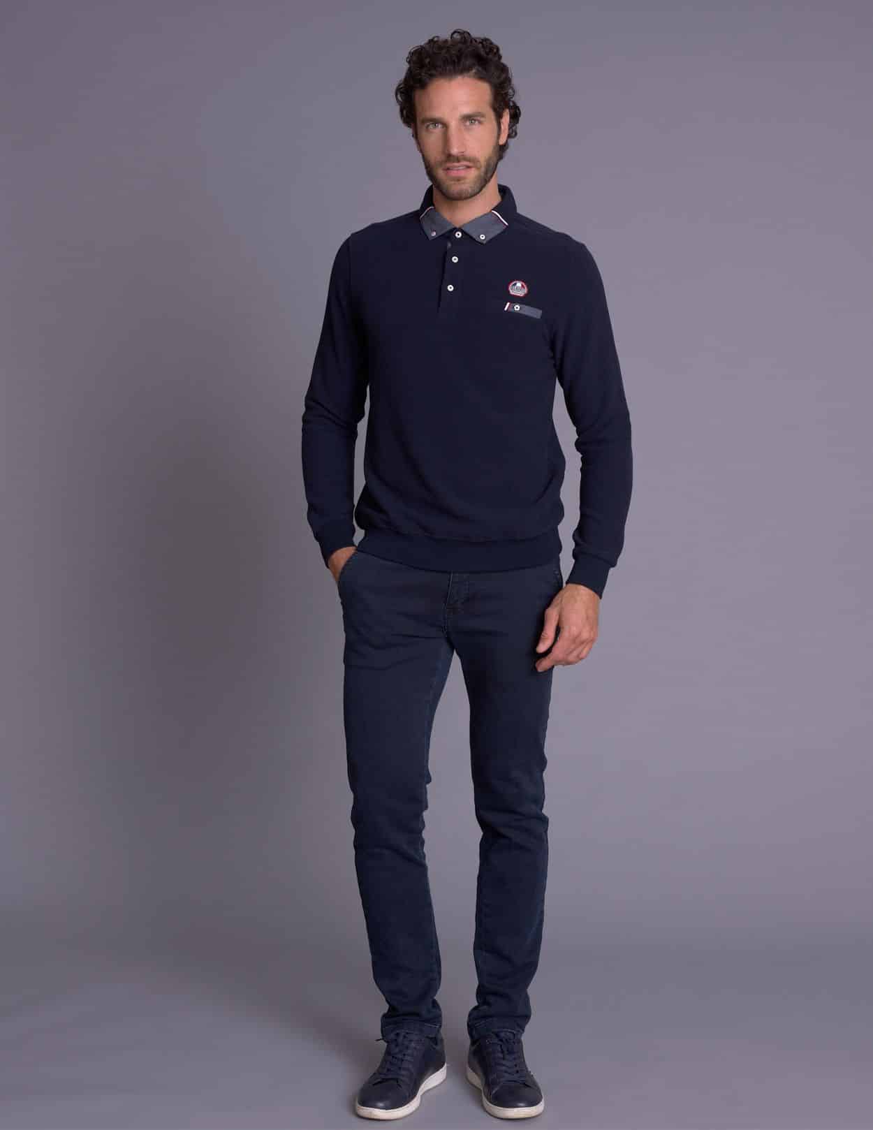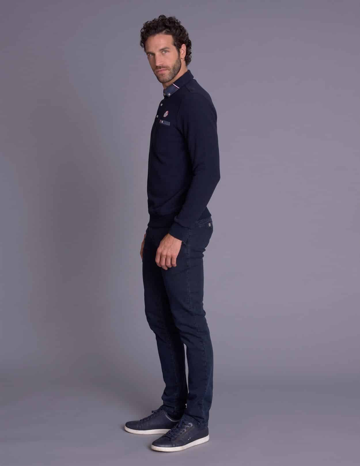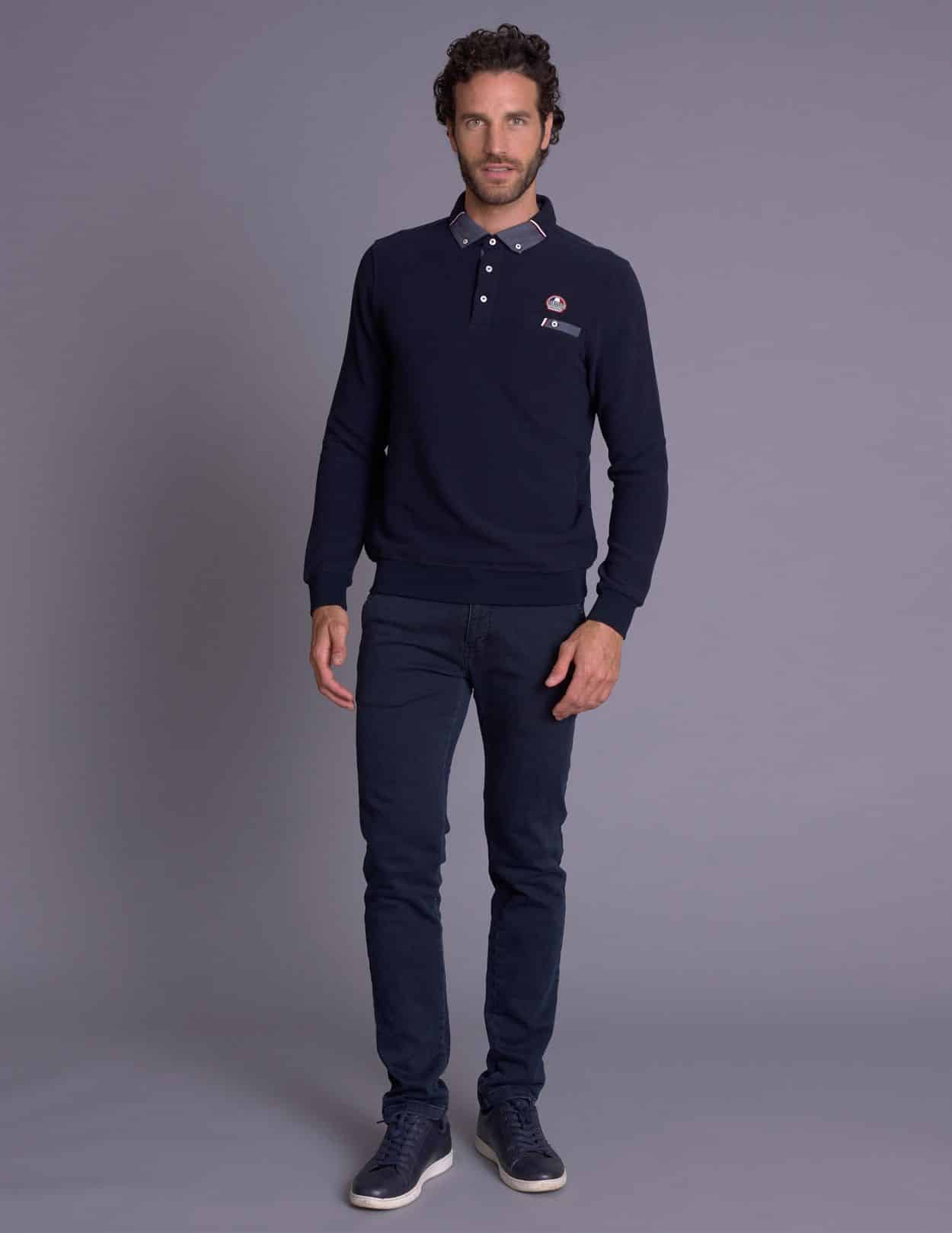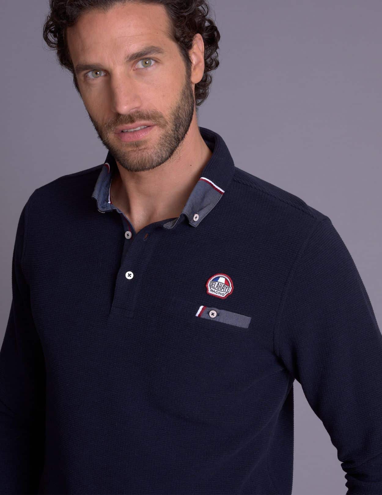 Polo LISPACH navy en coton et polyester. Coupe ajustée, manches longues et écusson racing. Style sport automobile moderne et élégant.