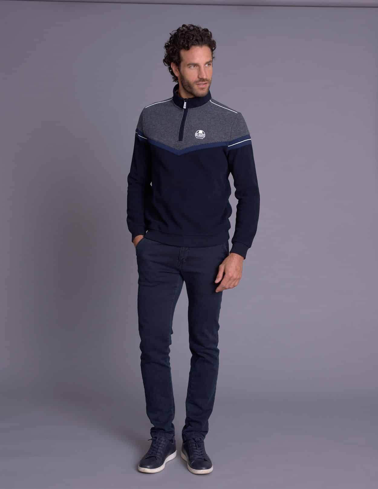 Sa coupe ajustée met en valeur une silhouette dynamique, tandis que ses empiècements contrastés gris sur les épaules et manches soulignent son identité racing. Le col montant zippé quart et le motif chevron apportent une touche technique distinctive.